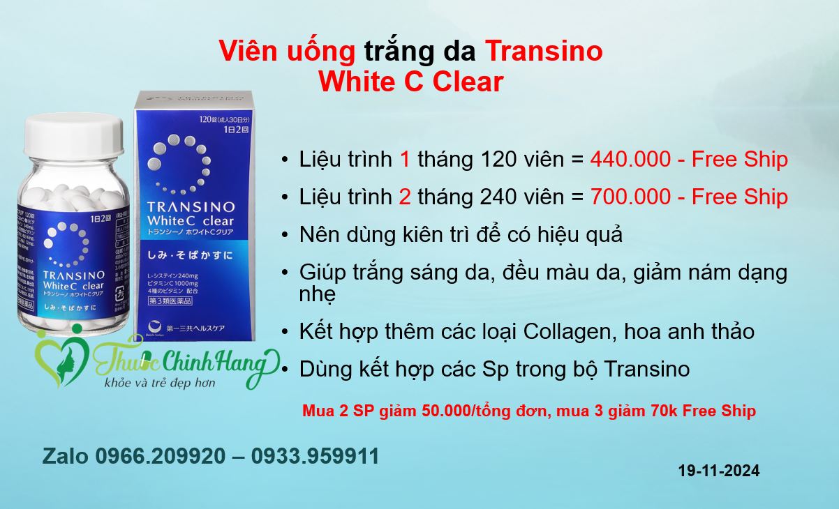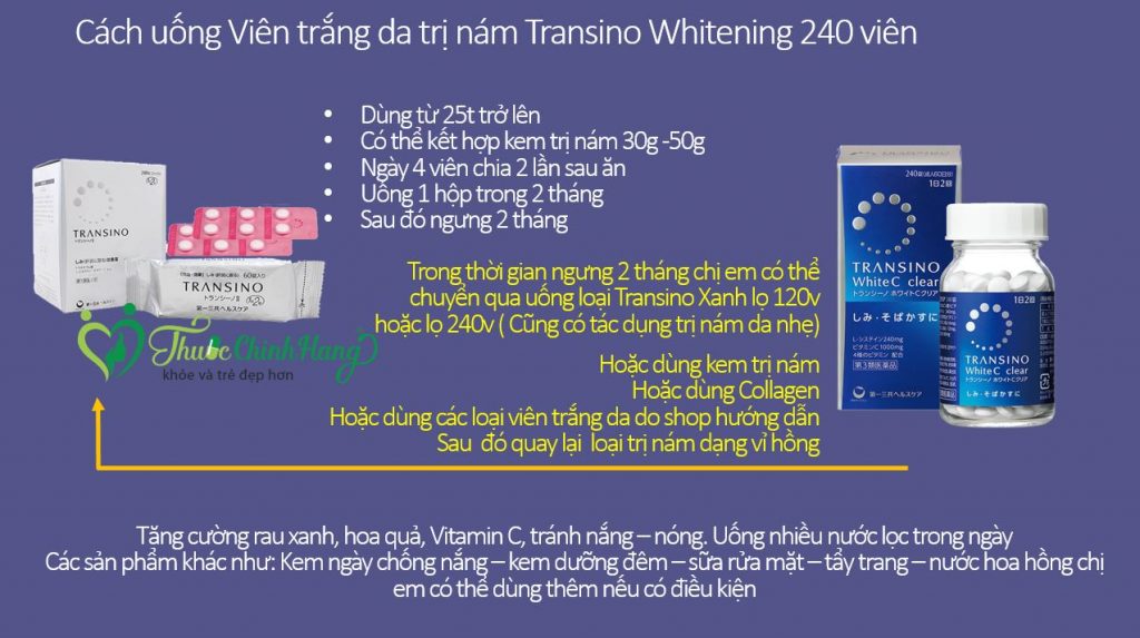 Trên đây là cách phân biệt 2 loại viên uống transino đang được khách hàng dùng nhiều trong thời gian vừa qua, nói chung khi bạn cần công dụng trắng da, mờ nám thì chọn mua transino white C. Khi bạn cần trị nám tàn nhang lâu năm do nội tiết tố thì nên mua transino ex 240 viên nhé !